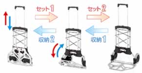 | ■特長 ●アルミ合金製パイプ(アルマイト加工) ●軽量でコンパクト ●静音ゴムタイヤ使用 ●セットや収納が簡単で、収納時は薄くたためますので、車への積み下ろしが容易です。 ■薄くコンパクトに折りたためるから、車のわずかなスペースにも搭載可能。 ![]() ■ワンタッチバンドストッパー付なので荷物の固定も簡単 ![]() ■荷物をしっかり固定して、安定搬送。 ![]() ■セット/収納は、2アクション ![]() ■タイプ