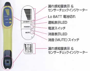 | ■機能 ●自動ゼロ調整機能 ヒートダイオードとマイクロプロセッサーコントロールにより、10秒間同じ濃度の場所にいると、その濃度を0とすること で、より濃度の高い場所、漏れの場所をピンポイントに検知できます。 ●アラーム機能 冷媒の感知量が多くなると、センサー先端のLEDが速く点滅し、アラーム警報します。 ●機能的なLEDパネル 作業状況に応じて上部/手元2箇所のLEDパネルを使い分けられます。 ![]() ●超小型強力モニターファン内蔵 4枚羽根の強力ファンが吸気、排気をしますので、ブザーが鳴りやまない感知継続等のトラブルがありません。 |