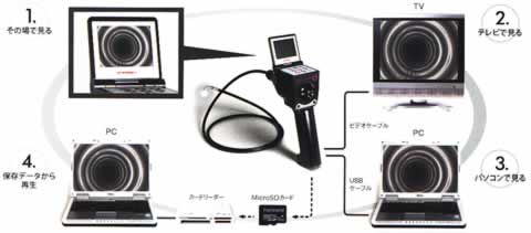 ■システム図 本体のSDカードやUSB端子、NTSCビデオ出力を利用すれば、PCやTVモニターへのデータ出力が可能です。 撮影結果の検証、顧客への説明・報告など目的に合わせてご利用頂けます。 ![]() ■検査画像 ●腐食配水管 ![]() ●配水管内部 ![]() ●電気機器内部 ![]() ■用途例 ●水道・・・給排水管の錆、腐食、詰まりなどの診断。 ●自動車・・・エンジン、CPUボックス、ドアなどの内部検査。 ●空調・・・空調機、エアコン内部検査、ダクト内の保守点検。 ●原動設備・・・ボイラー、熱交換器などの品質検査、保守管理。 ●エネルギー・・・各発電所設備の保守管理。 ●製造・・・精密部品、金属加工部品、金型加工品の品質検査。 ●建設・住宅・・・壁内の断熱材、鉄骨の診断、内部配線の断線確認。壁・床下・天井裏などの観察。 ●電気・・・トランス・配電盤内部の観察。 ●輸送・・・輸送中の梱包物内部の状態観察。 ●その他・・・美術品、発掘品の内部状態の観察。動物の生態調査。 ■構造図 ![]() ![]() ![]() ![]() ![]() |