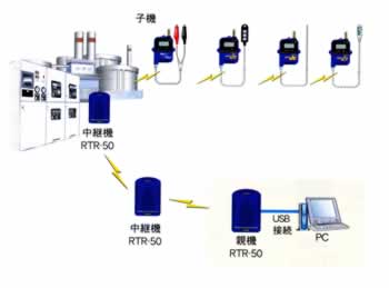 親機・中継機両用 無線通信距離の延長が可能 ●親機としても中継機としても使用可能。 ●1グループ250台×250台グループ ●パソコン上でモニタリング ●記録データの自動収集 |