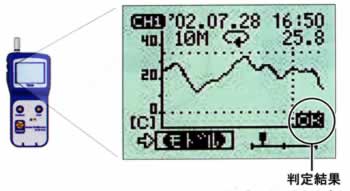 ■グラフ画面![]() 上限・下限値を越えた場合は、【NG】と表示されます。 ■仕様 ●MDTR-51AシリーズMDVR-52のデータは無線通信によって収集します。 ●データ量によって最大250ファイルのデータ吸い上げが可能です。 ●データロガーに対して記録モード、記録間隔、記録の即時スタート/予約スタートの設定が出来ます。 ●無線通信対応の子機の場合は、パソコンを介さず現在測定値のモニタリングが出来ます。 モニタリング動作中、あらかじめ設定した上下限値を超えると内臓ブザーでお知らせします。 ●収集したデータを1チャンネル毎にグラフ表示します。ジョグダイヤルやボタンを操作して、左右にスクロールしたり、 チャンネルの切り替え表示が出来ます。 測定値の上限値/下現値を設定しておくと、データ吸い上げ時に、判定結果を表示します。 |