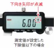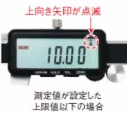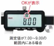 | ■用途 外側・内側・段差・深さ測定 ■材質 ステンレス ■電源 CR2025(リチウム電池)テスト用1個付属 ■使用例 ![]() ①「ON/OFF」ボタンを押し、電源を入れます。 ②外側測定子を閉じた状態で、「ZERO」ボタンを1回押します。 ③「TOL」ボタンを1回押します。 ![]() ④9mmのブロックゲージをはさみ、「9.00」が表示された状態で「TOL」ボタンを1回押します。(上限値の設定) ![]() ⑤7mmのブロックゲージをはさみ、「7.00」が表示された状態で「TOL」ボタンを1回押します。(下限値の設定) ![]() ■これでこのノギスに、7.00mm~9.00mmの公差が設定されました。