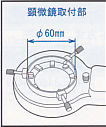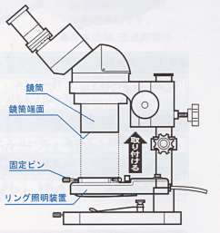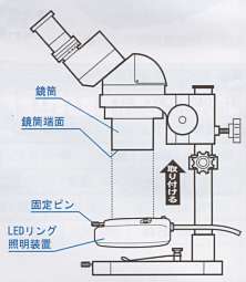 ■別売照明装置 ●ME9K-8 リング照明装置を鏡筒端面に当たるまで差し込み、3本の固定ピンで均等に固定して下さい。 ※鏡筒が平行でない機種には、アタッチメントが必要です。