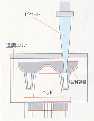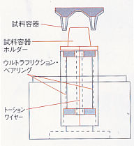 | ■動作原理 ●本装置は検体を自由振動させ、その振動減衰と周波数を測定するレオメーターファミリーです。原理的な設計を行い、実用化へ向けて変更を加えました。 ●ゼロ調整した装置で検体に固有な減衰と周波数シフトを測定すると、検体の流動特性に関する情報が得られます。測定を反復実行すればレオロジー特性の径時変化を研究することもできます。 ●分析形は円筒状の測定キュベット(試料容器)を備えており、縦軸の周りで自由振動始めます。この軸は測定キュベットホルダーの底と装置のベースを繋ぐ捩りワイヤーと一体になっています。本質的に本装置はスプリングと振動質量から成る機械振動回路を構成しています。 ●基本的にはスプリングの強化と質量の慣性モーメント(質量×回転軸からの距離)が振動周波数を決定しますが、装置の詳細な構造(測定キュベットや測定キュベットホルダーなど)によってこの周波数が変動します。 ●サンプルを入れない状態での本装置の振動周波数は約10Hzです。 ●流動特性パラメータと振幅・周波数変化との間には相関関係が存在します。 ■粘度測定及び凝固試験システム