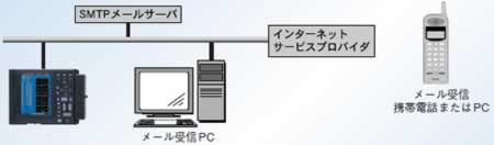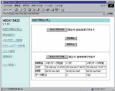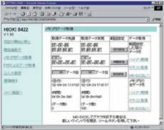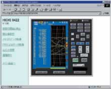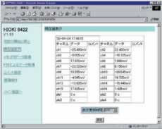 | ■LAN接続から電話回線経由のPPP接続まで対応 - 通信機能 - LAN 接続またはPPP 接続(RS-232C 端子にモデムを付け、電話回線や携帯電話/PHS と通信)により、以下のPC計測や各種WEB サーバ機能が使用できます。 ■ パソコンからの操作 ・ロガーコミュニケータ9334(オプション)によるリアルタイムPC 計測 ・FTP サーバ機能による、PC カード/ 内部メモリのデータ取得 ・HTTP サーバ機能による、WWW ブラウザからの遠隔操作 ■ 本器からの自動送信 ・E-mail 機能によるメール送信機能 ・FTP クライアント機能による、データ自動送信 その他、PC とRS-232C による直接接続も可能です。 ・PCとの通信において、FTPではファイル単位のみでのデータ取 得ができます。 ・9334使用ではLAN接続の場合100msからの速い時間間隔に対応 しています。 ・RS-232Cと直接接続の場合はお客様側でプログラムを作成してい ただく必要があります。RS-232Cと直接接続の場合では1秒以上 の遅い時間間隔でのリアルタイム測定は可能です。 USBしかないパソコンでも使えるの・・・? 市販のUSB-LAN変換器を利用することで、USBしかないパソコンでもMF128420-50, MF128421-50, MF128422-50でPC計測を行うことができます。 詳しくはお問い合わせください。 ■HTTP サーバによる遠隔測定 HTTPサーバ機能とは、パソコンに専用のアプリケーションソフトをインストールすることなく、Internet Explorerなどの一般的なwwwブラウザを使用して、本器の設定やデータ取得、画面監視を行う機能です。 【10BASE-T LAN 経由でHTTP 通信する場合の接続例】 ![]() ■機能の詳細 【遠隔操作画面】 ・本器で表示している画面をそのままWWWブラウザに表示します。 ・本器と同じパネル配置で、キー入力することができます。 ・モノクロ/ カラー表示の選択、画面更新レートの選択ができます。 ・画面を更新すると、開始LEDの点灯・消灯も更新されます。 ・画面内をクリックすると、上下左右のキーを使わずに点灯カーソルの移動ができます。 ![]() 【FTP によるデータ取得】 ・本器のPCカードのファイルと内部メモリに測定されたデータを FTPを使ってWWWブラウザから取得できます。 ・測定中は、内部メモリに測定されたデータの取得はできません。停止後取得できます。 ・測定中の内部メモリデータは、メモリ内データ取得画面で取得できます。 ![]() 【測定の開始と停止】 ・測定の開始と終了をWWWブラウザで制御できます。 ・現在の測定状況を表示することもできます。 ![]() 【現在値表示】 ・測定しているデータを数値で表示できます。 ・測定中は、記録間隔毎に取得した各チャネルのデータをモニタできます。 ・測定停止中でも、各チャネルに入力されている瞬時データをモニタできます。 ・画面更新レートも選択できます。 ![]() 【メモリ内データ取得】 ・内部メモリに測定されたデータを測定中、または停止後に任意の範囲を指定してブラウザから取得できます。 メモリ内の全データの取得もできます。 ・バイナリ・テキストデータが選択できます。 ・データをMS-EXCELへ転送して自由にグラフ作成することができます。 ![]() |