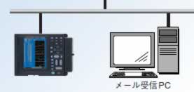 | ■便利な通信機能を追加! - 通信機能 - 本器から、開始トリガ、停止トリガ、警報、停電復帰、メモリフル、カードフルなどが発生した時に、SMTP メールサーバを介してネットワーク内または遠隔地のパソコンやE-mail 対応の携帯電話にE-mail が送信できます。 送信先は3 アドレス登録することができます。 (警報にはディジタルI/O ユニット8993が必要です。) 【10BASE-T LAN 経由でメール送信する場合の接続例】 ![]() ■FTP クライアントによるデータ自動送信 本器から、測定中に定期的または測定後にPCカードに自動保存されたバイナリデータファイルを、ネットワーク内または遠隔地のパソコンのFTPサーバに自動送信できます。 【10BASE-T LAN 経由でデータFTP 送信する場合の接続例】 ![]() ■PPP 通信(RS-232C+ モデム) 本器とモデムをRS-232C ケーブルで接続して、モデムを接続した遠隔地のパソコンで測定ができます。 本体とRS-232C ケーブルMF129721(ストレートケーブル モデム用)を接続します。 ■PC 用アプリ・・・波形ビューワWv が標準付属 MF128420-50シリーズで測定したデータ(バイナリ形式)をパソコン画面に波形を表示させることができます。 またCSV 形式のテキストデータに変換できますので(ファイルごとの変換と一括変換が可能)EXCEL 等のPC アプリにデータを読み込むことが可能です。 ■仕様