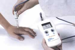 本器は温度計を内蔵した日常防水型のポータブルpH計で、特に皮膚のチェック用に設計されており、化粧品や薬の生物学的適合性を調査する研究室にとって不可欠な物です。また正確さと反応の速さと簡単な操作性を併せ持っています。 専用の電極の先端部は検体と完全に接触でき、また内蔵温度センサーにより自動的に温度補償されます。 |