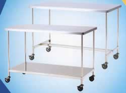 製薬・化学・半導体関連・食品工業分野に・・・ SUSキャスター付 キャスター金具を含め、オールステンレスだからあらゆる環境にも安心してご利用頂けます。 また、溶接で組あげておりますので、脱落等の恐れのあるビス・ボルト・ナット等は使用しておりません。 作業台の下段部分にはステンレス板棚仕様とH型補強枠の2タイプがあります。 |