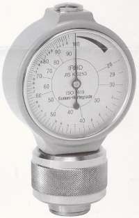 | ■測定方法 ●試験片は少なくとも6mm以上のものとされていますが、6mm未満でも積み重ねて6mm以上として計測できます。積み重ねる枚数は3枚以内とし、かついずれも2mm以上の厚さがあるものとされています。 ●試験片の横方向の寸法は押し針先端が試験片の端から12mm以上離れた位置で測定します。 ●一般的には加圧面と接触するゴム表面は平滑でなければなりませんが、ゴムロールなど、ある種の特殊な形状への応用は認められています。 ●加圧面を試験片に対し垂直になるように置き、軽く支えて下さい。定荷重(2.65±0.15N)がかかりますので、1秒以内に目盛りを読みます。これを6mm以上離れた位置で5回測定し、その中央値をとります。 ■ダイヤルゲージの校正 ●付属の校正用鋼板に押針を押しつけ、100を示せば正確です。もし、100を示さない場合は、本体下部のネジをゆるめ、針を校正用鋼板に押しつけたまま、100を示すよう、注意深く調整して下さい。 ■仕様
