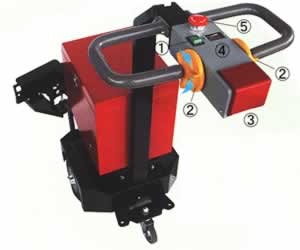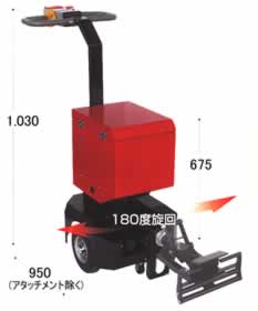 バッテリー式の電動牽引車 牽引重量:500kg ●多用性 ・ワンタッチの簡単連結(ボルト締め不要) ・色々な車輪付台車、かご車の移動が可能 ・連結用アタッチメントの交換により、多種の台車に対応 ●簡単操作 ・走行は回転式レバーを指で操作するだけ。前進・後進、速度調整も自由自在 ●安全性 ・非常停止スイッチ、挟み込み防止(停止)スイッチ付(緊急時に操作ボックスが体に触れると停止) |