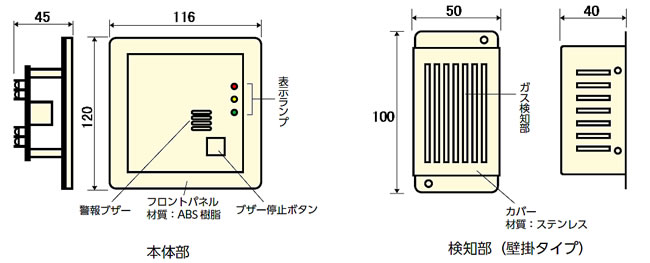 | ■特長 ●拡散式 設置個所の濃度に反応します。 ●接点出力 アラーム、換気扇など外部機器との連動ができます。 ![]() ![]() ■仕様