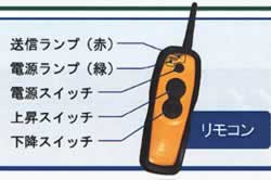 | ■リモコンだから ●荷揚げ作業が離れたどの位置からでも遠隔操作できる(電波到達距離約30m) ●便利に使えるストラップ付き ●小型で、外周を破損防止のゴムで覆った握りやすいタイプ ■渦巻防止/逆巻防止機構の採用 ワイヤーの巻き過ぎ、逆巻きを防止する ■非常下降用スイッチ リモコンが操作不能になった場合、非常下降用スイッチ(赤色ボタン)を押して吊り荷を降ろします。 ※押している間下降します。 ■免許不要 リモコンは、「技術基準適合証明」を取得済み。無線利用許可等の申請手続きは、不要。 ■リモコン ![]() ■タイプ