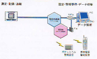 各種センサー、計装装置から出力される電圧・電流・パルス信号を記録するロガーと、モデムを組み合わせた新しいタイプのデータロガーです。遠隔地で記録したデータの収集を、電話回線を利用して容易に行えます。