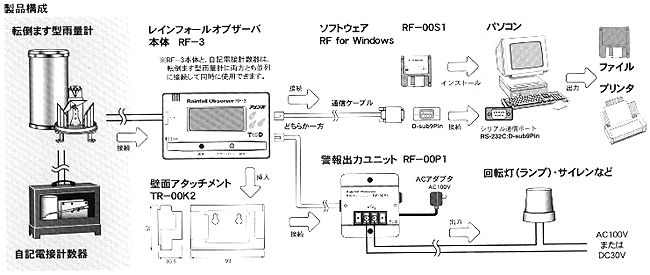 ■専用ソフト 本体の記録設定や、記録されたデータのグラフ化・表計算といった処理を簡単に行えます。 ●積算雨量を棒グラフで表示:記録データを本体から吸い上げると、自動的に棒グラフを表示します。棒グラフの表示間隔は10分・1時間・1日・1ヶ月の4種類から選択できます。 ●データ一覧表も表示:棒グラフと同様に表示間隔は10分・1時間・1日・1ヶ月の4種類から選択できます。 ![]() ■警報出力ユニット 本体に警報出力ユニットを接続しておくことにより、回転灯(ランプ)やサイレンなどを警報動作時に連動できます。 接点容量はAC100V : 3A以下、DC30V : 3A以下です。 ![]()
