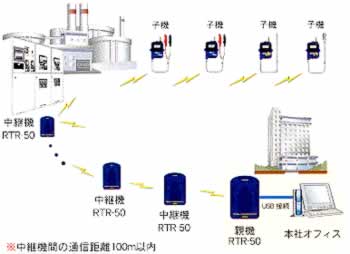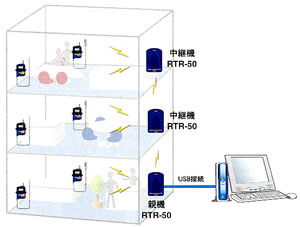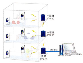 RTR-50は、親機として子機データを無線で収集、また中継機として無線通信距離を伸ばすことができる、親機・中継機両用の製品です。