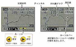 グラフィック液晶搭載によって、収集したデータをグラフ表示します。グラフは1チャンネル分のデータ毎に表示され、ジョグダイヤルや本体前面ボタンによって左右にスクロール表示できます。