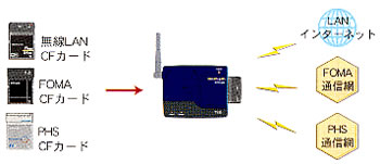 市販のCFタイプカードを本体に挿入すれば、無線LAN、FOMA、PHSも利用可能です。