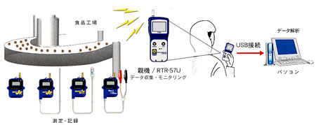 送られてくるデータは親機であるハンディデータコレクター「RTR-57U」で収集し、データ収集や現在値確認のために子機を設置場所から移動させることなく、その場でデータ収集や記録の開始設定、測定値の判定が行えるようになります。