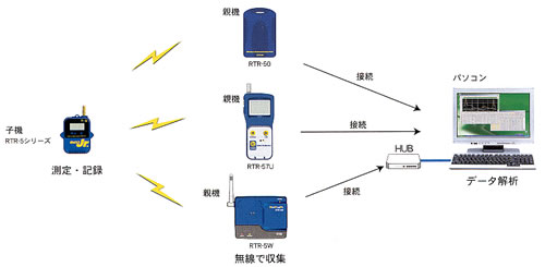 | RTR-5シリーズの親機として子機データを無線で収集、また、中継機として無線通信距離を伸ばすことができます。また、付属ソフトによりグラフ表示、印刷などが可能です。 |
