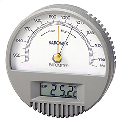 デジタル温度計付気圧計。 置針により気圧の変化がわかります。 また、ABS樹脂製の壁面固定用フランジが付属していますので設置も容易です。 |