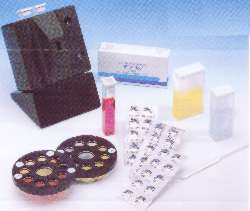 | 検査セット(本体、比色ディスク、検査水比色管、100テスト分試薬、ハードケース等) 次の検査セットを標準仕様で用意しています。追加の試薬や比色ディスク等の価格に関しては追加オプション価格表を ご参照ください。
