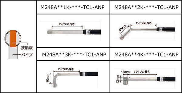 ●A形シリーズは汎用タイプの静止表面用温度センサです。ヘッドサイズ、ガード材質、パイプの長さ等、用途に合わせて項目を組み合わせることができます。