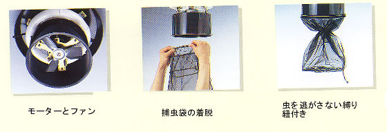 | ■特長 ●誘虫ランプで虫を誘引し、モーターファンで網袋に捕獲 ●静音モーターを採用(26W)、しかもランニングコストが安い! ●取付場所に困りません。省農薬の担い手! ●虫が感電するパチパチ音がしません。また、飛び散りません。 ●構造がシンプルで故障が発生しにくい。粘着紙式に比べメンテナンスに手がかかりません。 ![]() ■タイプ ![]() ■仕様