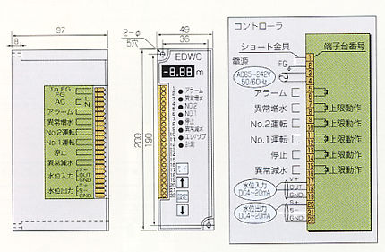 ■水位センサの概要 汚水・汚物水・雨水・河川水等の水位を地上部へアナログ信号として連続 出力します。 従来のフロートスイッチの様な可動部がないので液面の波立ちや浮遊物の 付着による誤動作が少ない。 ![]() ■水位センサ用コントローラの概要 センサからのアナログ信号を水位表示(デジタル)し、ポンプ制御用の接点出力を標準搭載しています。電源電圧は、フリー電源のため100V級、200V級の区別がありません。 ![]() |