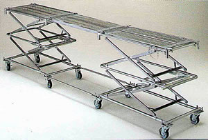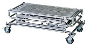 ●高さがワンタッチで5段階(440mm、865mm、1100mm、1260mm、1425mm)に調節可能。 ●連結可能で広さ自由自在。 ●折畳式で非常にコンパクト。 ●荷物を積んだまま台車替わりに使用可能。 ●スチール製亜鉛メッキ仕上げ |