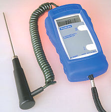 落としても壊れない ポータブル温度計です。滑りやすい厨房内での万が一の落下にも専用設計されたゴムのブーツが本体を強力にガードします。また、センサーと本体部のコネクター部はゴムでシールドしております。 従来この部分から油などの侵入による機器のトラブルが多発していますが、この製品ならば問題ありません。 シンプルな2ボタンのみです。 |