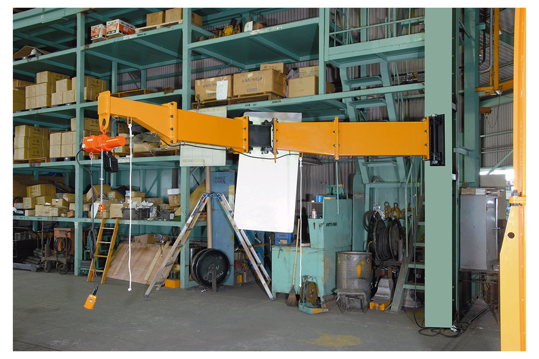 ●機械横に設置、加工材料の取付け、取外しに。建屋柱に取付け、天井クレーン下での補助作業に。