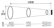 測定領域は距離200mmで直径Φ25mm、距離800mmで直径Φ100mmになります。
