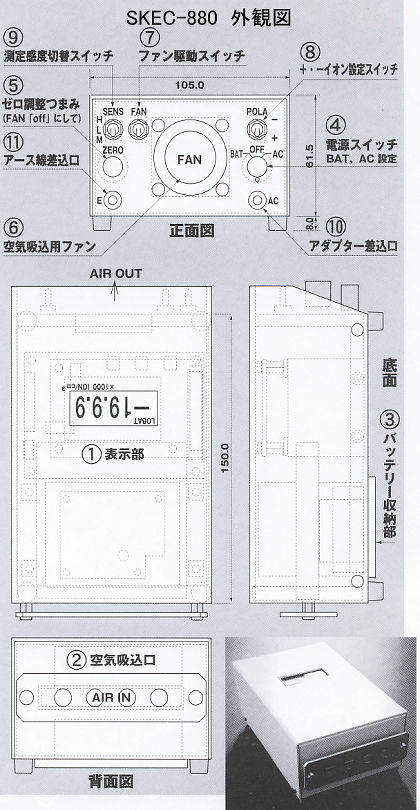 各部の名称と働きの説明 ①表示部:マイナスイオン・プラスイオンの測定量を×1000個/cm3で表示します。 例えば、-01.6と表示された場合はマイナスイオンが、1cm3あたり1600個という意味です。 (プラスイオンの場合、+と表示しません) また乾電池を使用時に、電池の寿命が近づくと「LOBAT」と表示します。 ②空気吸込口:測定時に周辺の空気を取り入れます。吸込口から、電極板が見えます。 ③バッテリー収納部:9V(006P)アルカリ乾電池を1個収納します。 ④BAT・OFF・AC(電源スイッチ):スイッチ真中が電源切り(OFF)、左に回すと乾電池で駆動(BAT)、右に回すとACアダプターで駆動(AC)します。通常は、ACアダプターでご使用ください。 ⑤ZERO(ゼロ調整つまみ):測定開始前にイオン検出プレート部の+・-イオンをゼロに調整します。 ⑥空気吸引用ファン ⑦FAN(空気吸引用ファン駆動スイッチ):上がON/下がOFF ⑧POLA(+・-切替スイッチ):測定するイオン(マイナスまたはプラス)の種類を設定します。+・-同時には測定できません。 ⑨SENS(測定感度切替スイッチ):測定範囲を設定します。通常はMで測定ください。 <測定範囲>H:10~19.99×10 3 個/cm3(~19,990個cm3) L:1000~1999×10 3 個/cm3(~1,999,000個cm3) M:100~199.9×10 3 個/cm3(~199,900個cm3) ⑩AC(アダプター差込み口):付属のACアダプターのコネクター部を差込みます。 ⑪E(アース線差込み口):付属のアース線を挟み込みます。 ⑫静電気遮蔽板取付け図:静電気遮蔽板を取付けた状態です。 使いかた ■電源スイッチをいれる前に・・・ ◎これから測定する+もしくは-のイオンの種類を決めてください。(POLA) ◎ファンのスイッチはOFFにしてください。(FAN) ◎測定範囲を決めてください。(SENS) H:少量のイオンを測定するとき。表示される数値は不安定です。数100個~数1000個のイオンがあると考えられるとき。 L:コロナ放電のように数10万個のイオンが発生していると考えられるとき。 M:通常はここで、測定ください。7~800個以上10万個位のイオンがあると考えられるとき。 ◎静電気の影響を排除し安定した測定を行うために、できるだけ付属のアース線でアースをとってください。(E) ◎長時間の測定を行う時は、付属のACアダプターをご使用ください。(AC) ■ゼロ調整をします。(ZERO) ◎電源スイッチをいれます。(BATもしくは、AC) FANのスイッチはOFFにしてください。 表示部に数宇が表示されますが、大きな数値から小さな数値に変わり、数字の動き(変化)がおちつくまでお持ちください。 ◎ZERO調整つまみをほんの少しずつ回して、表示部の数字をほぼゼロにします。例えば、Mでマイナスイオンを測定の場合、-00.1~-00.3位にします。 ■FANのスイッチをONにします。測定開始です。 ■測定範囲を“M”から“H”または“L”に切替えるとき、またはイオンの種類を変えたいときは、必ずファンのスイッチをOFFにして、その都度ゼロ調整を行ってください。 ■測定終了後は、電源スイッチをOFFにします。 ■乾燥した場所に保管してください。 ![]() ![]() |