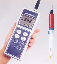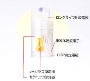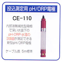 1本の電極でpH/ORP/水温測定 電極を交換しないで測定モードを切り替えてpHとORPが測定できます。 自己診断機能 電池電圧チェック・電極の良否判断・標準液の識別、校正エラー等各種メッセージを表示 オートパワーオフ機能 電源の切り忘れを防止する為30分後に自動的に 電源が切れる省エネルギー機能 生活防水構造 計器は生活防水構造でしかも計器の汚れを防ぐためのビニールカバー標準装備 投込測定電極をスタンバイ 深い水面化の測定の為に水圧に強いダブルジャンクッション型で内部液無補充補型の投込測定 電極(CE-110)を準備(オプション) |
