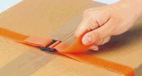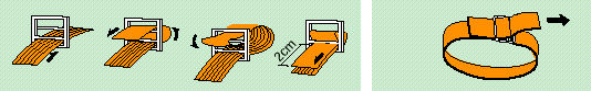 | ■使用方法 ①結束する部分より折り返し分だけ長めにテープを切り、バックルを固定します。 ②結束するものに巻きつけ、バックルに通します。折り返してテープを充分に引っ張り、密着させます。 ![]() ■用途 ●在庫品の固定に。 ●本などの持ち運びに。 ■仕様