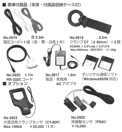 PA-600の6大特徴 1.真の実効値で計測し、単相2線、単相3線、三相3線に おける測 定電圧・電流のバランスが取れていない不平 衡電路も正しく測定 できます 2.本体の計測記憶インターバルデータをRS-232C通信 でリアルタイムでパソコンへ転送でき、オリジナルソフ トで測定デ ータを簡単にグラフや表にしてプリントでき ます。市販ソフトで加工 ・解析も自由自在です 3.オプションの非接触電圧センサにより、充電部に触れる ことなく安全 に接続ができます 4.本体のデータ記憶容量は、連続210日間(30分インタ ーバルデ ータ)の記憶ができます。また、積算有効電 力量の連続加算計 測が行えます 5.本体、クランプ、各種コード、通信ソフトなど計測に必 要なフル装 備で、10万円を切った価格。資産計上のい らない超低価格を実現 しました 6.測定開始/終了設定、PT/CT設定、時計などの測定 に便利な 各種機能とバックアップ電池を標準搭載しました |