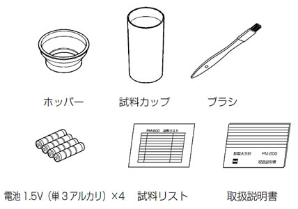 ホッパー、試料カップ、ブラシ、電池、試料リスト、取扱説明書 |