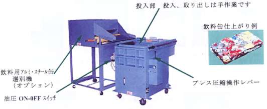 アルミ・スチール缶は圧縮プレスし、グロック化されます。 18リットル缶は一度に2個圧縮プレスできます。 今話題のペットボトルも圧縮プレスできます。但し、ブロックにはなりません。 全自動式でなくても良い。安価な物が欲しい。このようなご要望にお応えします。 特色 「SPPCAN-17」はアルミ・スチール缶・18リットル缶、さらに ペットボトルなどいずれにも使用できるパワフルタイプ。 電源はAC200V3相を使用。 |