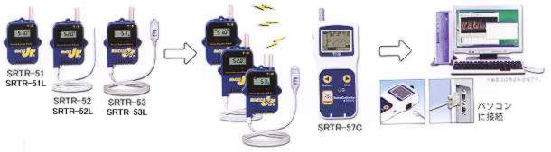 多機種のデータを簡単収集 SRTR-57CはSRTR-51/52のデータ収集はもちろん、TR-5シリーズ(TR-51A/52/51)・TR-7シリーズ(TR-71S/72S/71/72)・VR-71のデータをも簡単に収集できます。 SRTR-51/52に対しては無線通信や、TR-5シリーズと同じように、本体の前面に乗せて吸い上げをし、その他の機種は付属の通信ケーブルで接続し、吸い上げを行います。 データ容量:26万データ SRTR-57Cのデータ容量は約26万データです。これは、 SRTR-51・SRTR-52のフルデータ(16000データ)を16台分収集できる程の大容量です。 また、最高で250回分のデータを収集し管理することができます。 |