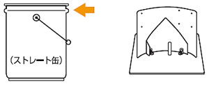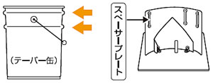 ■取っ手付き鋼製ペール缶のテーパー缶とストレート缶に使用できます。 ●補強が2段(矢印)のテーパー型ペール缶は、スペーサープレートを取り付けてください。 ![]() ●補強が1段(矢印)のストレート型ペール缶は、スペーサープレートを取り除いてご使用ください。