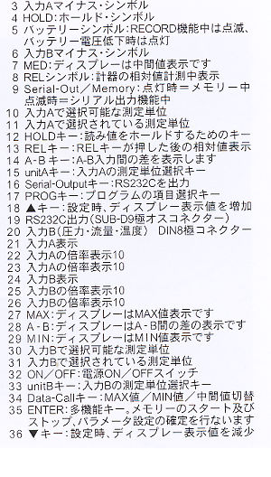 オート・パワー・オフ、オート・レンジ、ホールド、レコードMAX、MIN、中間値、偏差値、A-B(差)測定 |