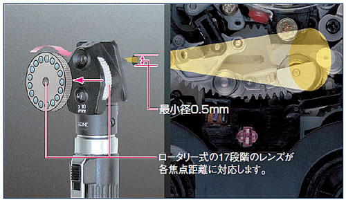 | ■特長 ●最小径φ0.5mm 肉眼では捉えきれない小穴も問題ありません。 ●最倍率10倍 小さなネジでも大きく見えます。 ●焦点5~250mm 17段階ロータリー式でレンズ交換します。 ●小型・軽量 ポケットに収納可能。 ![]() ![]() ■仕様