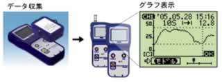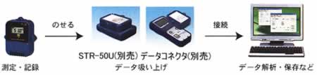 ●高速通信ですばやいデータ吸い上げ 従来品比約8倍の高速通信で、全データを吸い上げても約20秒間で完了します。 吸い上げたデータはパソコンでグラフ表示したり保存できます。 ![]() ●警報監視機能 ソフトウェアで設定した上下限値と判定時間を超えた場合警報が発生します。本体の警報LEDが点滅し、液晶にもエ ラーサインが表示されます。警報はデータを吸い上げるまで継続する為、警報発生を見逃しません。 ![]() ●アジャストメント機能 予め補正値を入力しておくことによって、補正された温度で表示、記録できるアジャストメント機能を追加しました。 ●アプリケーションの自動起動 コレクタにデータロガーを乗せると、機種を判別し適切なアプリケーションが自動的に起動するので、従来機との混 合使用環境において操作性に優れています。 ●時間を指定してデータ吸い上げ 時間を指定して必要なデータだけを吸い上げることができます。 ●データコレクタなら収集した場でグラフ化 データコレクタなら、パソコンまで移動しなくてもデータ収集ができ、データコレクタの液晶画面上でグラフ表示ができ ます。 ![]() ●パソコンでデータ解析 データコレクタで収集したデータは、パソコンに接続してデータ解析することもできます。 ![]() ■ソフトウェア コミュニケーションポートSTR-50U、またはデータコレクタに付属するソフトウェアです。 記録設定やデータのグラフ化、印刷等の処理を簡単に行えます。 データはテキスト形式でファイル化できますので、お手持ちのソフトウェアでデータを活用できます。 ![]() |