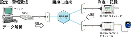 おんどとりTR-7Sシリーズで記録したデータを電話回線を利用してパソコンに転送し、データ処理を行う画期的なシステムです。 異常を監視してパソコン・ポケベル・ケータイなどへ警報を発信することもできます。 下記モデムポート(TR-05M1)併用で、おんどとりJr TR-5シリーズでも対応することができます。