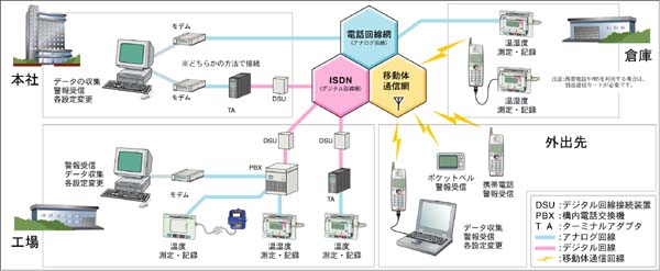 | データ自動収集機能 マニュアルでのデータ収集の他、毎日定時にまたは、一定時間間隔での自動収集ができます。収集されたデータは自動的にファイル化されパソコンのハードディスクに保存されます。 携帯電話対応 詳細 付属のモデムカードを、市販の通信カードと交換することで、携帯電話やPHSが利用できます。これにより、モデムポートの利用範囲が大きく拡がりました。 注意:モデムポートでは、弊社指定の通信カード以外は使用できません。 遠隔監視・警報発信機能 サーモレコーダに接続したモデムポートに、温度・湿度の上下限値を設定しておくと、設定範囲を超えた場合または外部機器からの外部入力があったときに、あらかじめ設定しておいたパソコン・ポケットベル・携帯電話に警報を発信したり、ブザー鳴動・外部出力ができます。 |