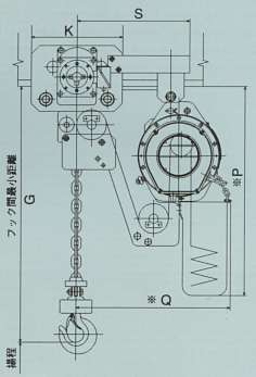 ローヘッド型とは、電気チェーンブロックのフック間最小距離が標準タイプより特殊設計により、素晴しく短い構造にしたタイプを呼称しております。 <構造> 2台の横行用トロリ、即ち横行電気トロリと補助トロリをアームで連結して、補助トロリに電気チェーンブロックをつり、アーム及び電気トロリの吊り板に設けた2ヶのアイドルシーブにより、下フックを電気トロリ側から降ろすようにしてフック間最小距離を小さくした構造です。 2ton容量で360mmと標準型電気チェーンブロックのフック間最小距離を40%短くしました。 2002年製 |