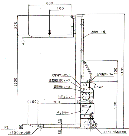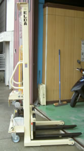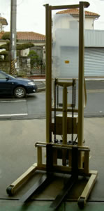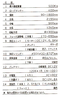 ■特長 ・350kg〜1000kg・・・・1.3m〜1.8m・・・昇降はバッテリー電動油圧式で、走行は手動式。 ・フォークの巾は調整することが出来ます。 ・フォーク部(荷受部)の上昇は上下操作レバーを押すだけで簡単楽々操作。 下降は上下操作レバーを手前に引くだけでワンタッチで下降速度が調整できます。 ・フットブレーキは1タッチ2ロックの足踏式・・・・・軽い力で簡単操作。 ・前方が見やすい透明な安全カバーが取付けてあり作業者の安全を守ります。 ・バッテリーは自動車用12Vを使用し、充電器は入力AC100V用が付いています。(別置式) ・バッテリーの充電時期は、バッテリーチェッカーが知らせます。 ・バッテリーの充電は充電器のプラグを接続するだけです。 |
