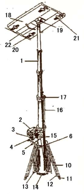 13、フットサポート 三脚を支えます。 14、据付リング ボディを三脚に固定します。 15、スチールロープローラー 先に7で案内しました。 17、プーリー スチールワイヤーを駆動するためのもの 18、荷台 バランスを保ち落下をふせぎます。 19、プラットホーム取付ネジ 揺れを防ぎます。 20、取出固定シャフト