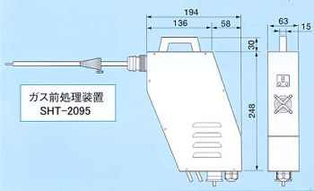 オプション品 ●高温用ロングプローブ (SHT-2111) ●ガス前処理装置 (SHT-2095) 急速冷却される排ガス中で結露が起こり、NO2(モデルB)が水分へ融解するのを防ぎ、正確な計測を行います。 |