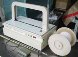 スイッチは手で押すか、足で踏む形になります。 ●使用テープ:指定テープ8o FB・FT・FS ●引締力:7kg ●機械寸法:約幅760×奥行300×高さ406o ●テーブル高さ:188o ●機械重量:20kg ●電源:単相100V |